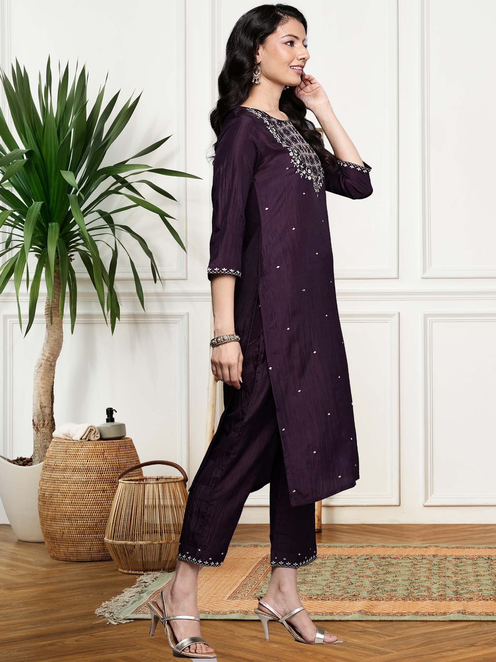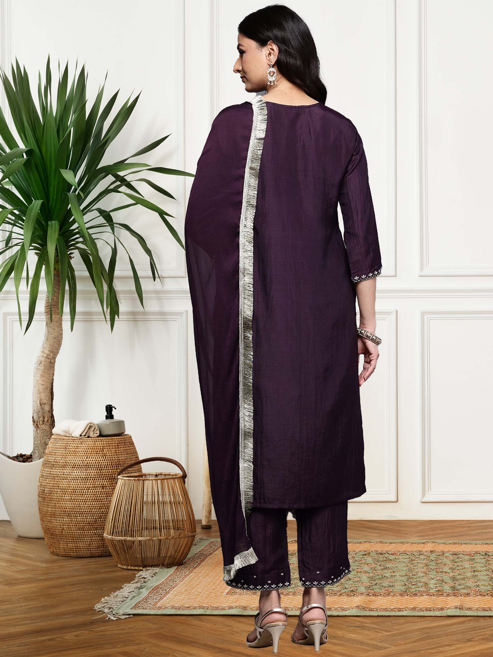 Wine Embroidered Straight Kurta Paired With Bottom And Dupatta