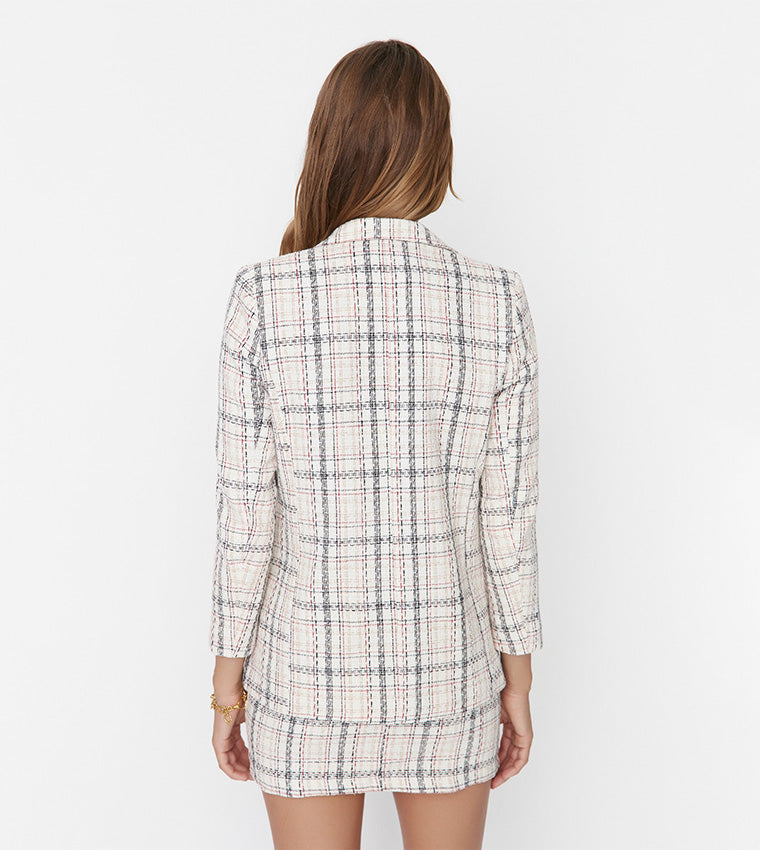 -Turn heads with this stunning 3-piece Co-ord Set, crafted to make bold fashion statements. The elegant white checkered blazer, matching mini skirt, and stylish crop top combine for a complete, powerful, and trendy look.