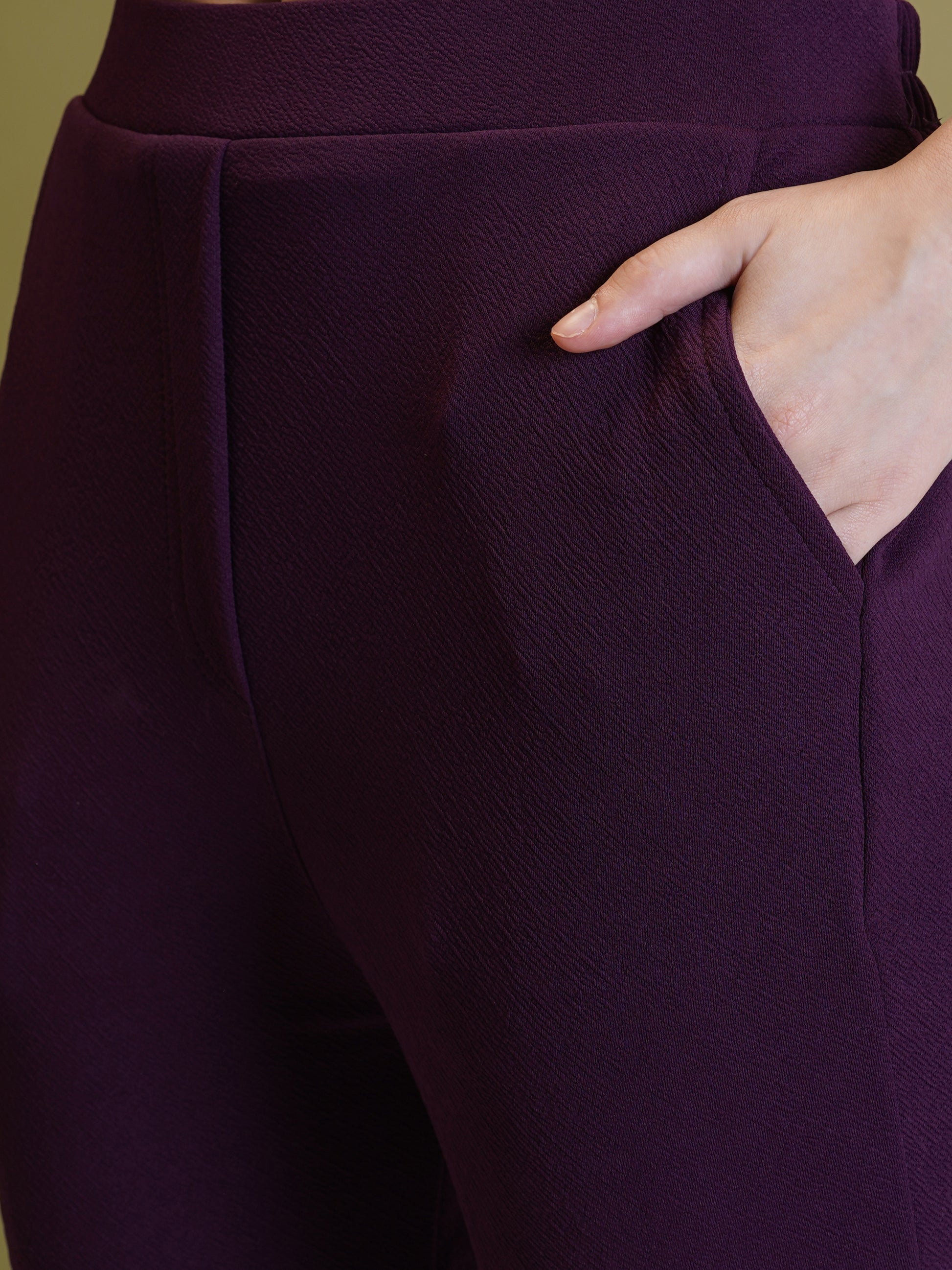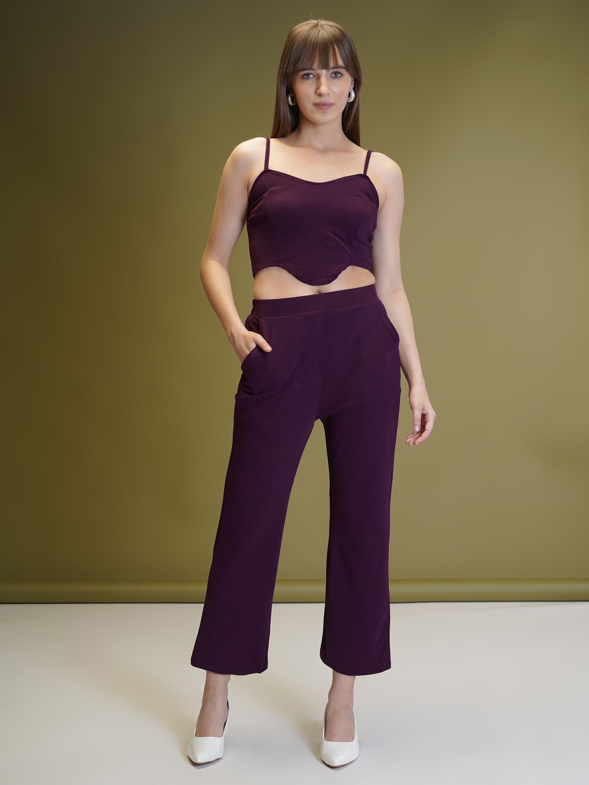 Look effortlessly stylish with this premium 3-piece solid purple co-ord set for women. This set features a chic full-sleeve blazer-style jacket, a matching crop top, and straight-fit pants – perfect for modern-day fashionistas who want both comfort and class.